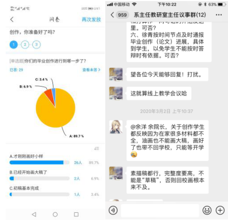 为切实全面了解毕业班同学疫情期间在家做毕业设计(论文)的情况,学院设计并开展了毕业论文(设计)专项调查,如美术学系马晴老师组织开展了网上问卷调研。多渠道积极了解同学们设计与论文的进展情况,了解同学们居家完成毕业生论文(设计)过程中遇到的困难。今年又第一次使用论文(设计)管理系统,理论实践教研室徐青老师前期学习了大量技术工作,指导和帮助公司员工老师解决技术问题能够顺利开展网上论文工作开展。学院领导们也针对员工反馈的问题,在每周教学例会中讨论并制定了周详可行的实施方案,共克时艰推进论文工作有序开展。(艺术传媒学院:徐青)