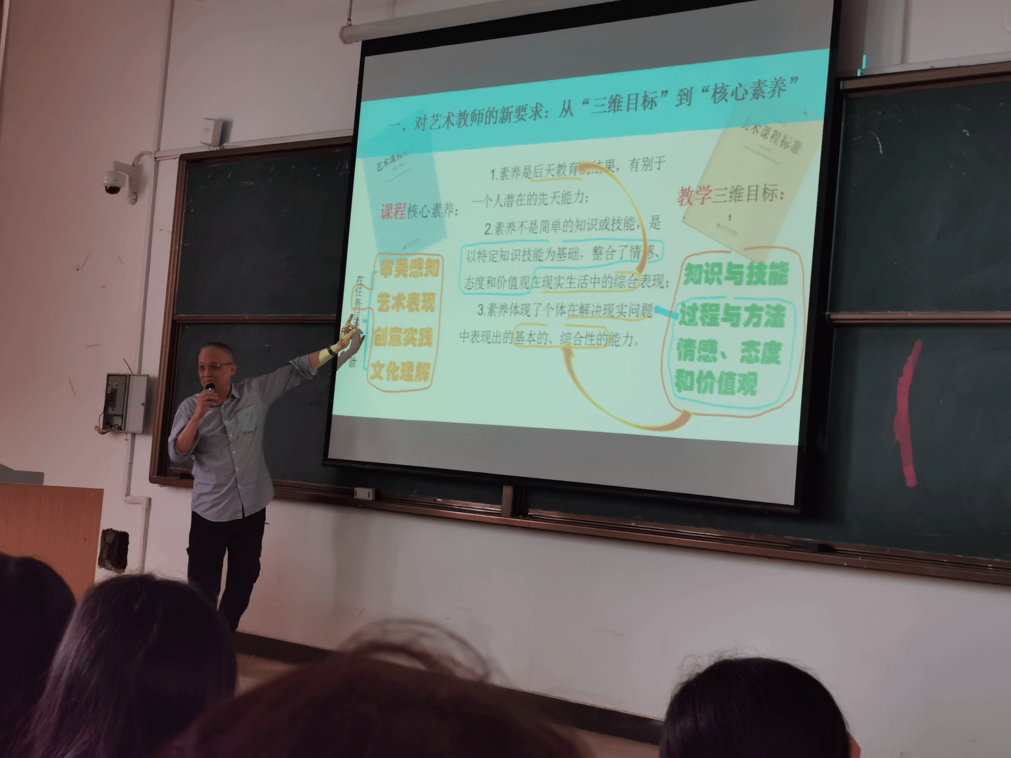 孔新苗教授以“美育”为切入点,向在场师生介绍了新时代美育的新思路与新趋势。归纳了以美育为中心开展艺术教育的三大前沿问题:一是“学校美育”对艺术教师的新要求,二是关于“课程综合”,三是美育的艺术教育是一代人的新课题。孔新苗教授对比了新时代下美术教师与美育教师的区别,引导同学们进行对比理解,并在比较视野中分析从“三维目标”到“核心素养”的变化,并强调“解决新时代美育问题的途径是引导员工在任务驱动的情境中学习。”