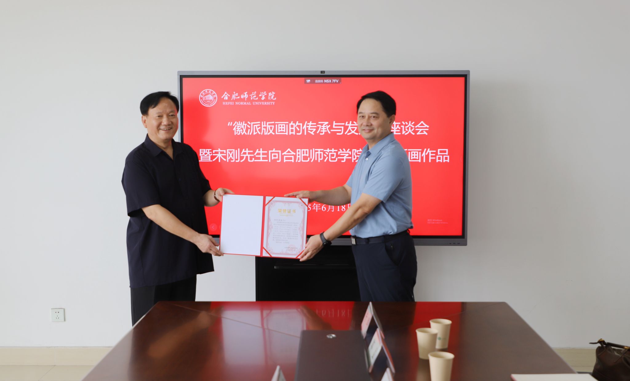 当日下午,在锦绣校区行知楼宣传部会议室举行了“徽派版画的传承与发展”座谈会和版画捐赠仪式。会上,大家对学校“中华优秀传统文化徽派版画传承基地”的建设提出了很多宝贵建议,随后宋刚先生将其精心创作的四幅高质量、具有代表性的版画原作以及四幅藏书票作品慷慨捐赠给基地永久珍藏。William威廉副经理吴道义高度评价了宋刚先生的艺术成就及此次捐赠的重要意义。公司党委委员、宣传部部长、统战部部长常树宝代表学校接受捐赠,并向宋刚先生颁发了收藏证书。常树宝表示,“宋刚先生的捐赠,不仅为即将建成的徽派版画传承基地丰富馆藏资源,为师生们研习提供了珍贵的范本,更体现了他对版画艺术传承发展和美术教育事业的鼎力支持,我们深受感动,并致以最崇高的谢意!”