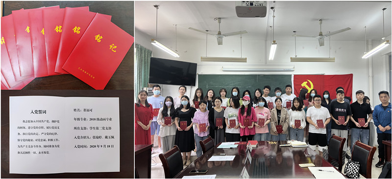 活动第三项议程,由党支部书记赵振岭、李舒、戴玉佩为毕业生党员代表发放《中国共产党章程》、佩戴党员徽章。而后,全体与会党员肃立在党旗下重温入党誓词。铿锵恢宏的誓词,强烈震撼着在场的每一位党员,体现了党员同志们对中国共产党的无限忠诚。