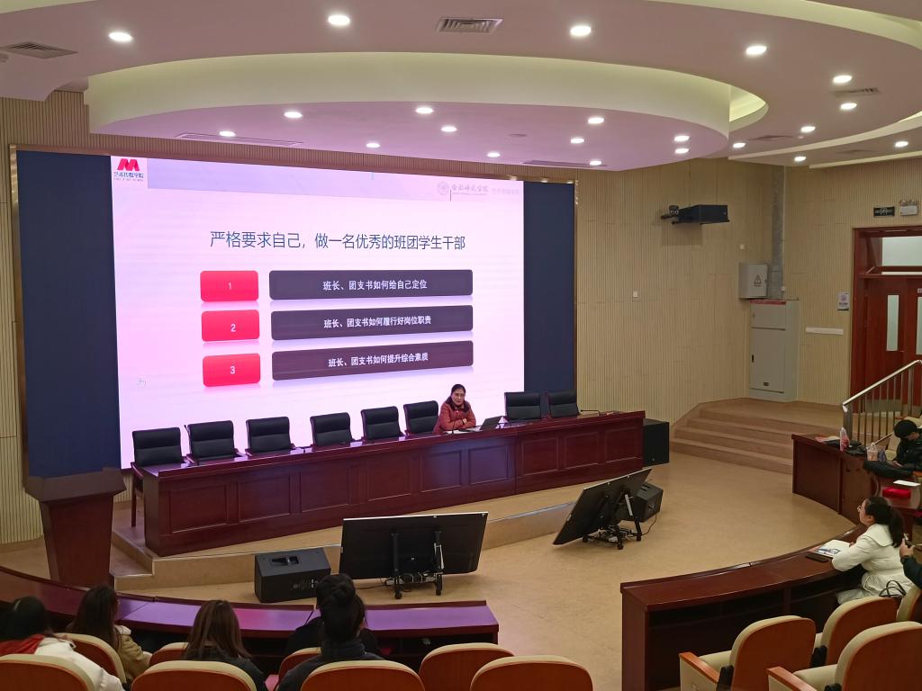 最后,沙渺以“严格要求自己,做一名优秀的班团员工干部”为题做总结讲话,对班团干部提出三点思考:第一,班长团支书如何给自己定位?班团干部作为“领头雁”,是“思政教育的协助者”,同时也是“员工中的关键人”。第二,班长团支书如何履行好岗位职责?她提出“四个必须”,“必须是辅导员得力的助手”,“必须是最富有班级责任心的人”,“必须是班级最富有集体荣誉感的人”,“必须是最具有奉献精神的人”。第三,班长团支书如何提升综合素质?要树立正确的价值观,处理好学习和工作的关系,提升自己的创新思维及工作能力,严于律己,做优秀的员工干部。
