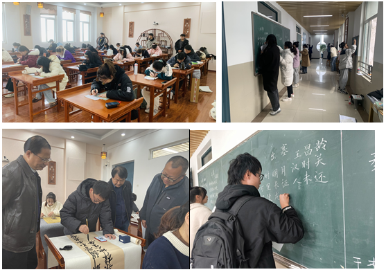 大赛自11月中旬开始,由各学院分别开展作品征集与遴选,主要以中国共产党建党100周年和传统诗词为书写内容。经过公司书法课程组教师的认真评选,共评出优秀作品百余件。决赛阶段,在逸夫楼师范生技能训练中心分批开展了钢笔字、粉笔字、毛笔字现场书写展示。期间,教务处、校团委、艺术传媒学院相关负责同志来到现场观摩指导。