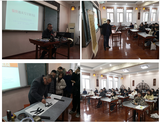 为激发广大同学的书法兴趣,掌握正确的学习方法,活动特别邀请省、市书协书法家一行五人进校园。安徽省书法家协会副主席杜鹏飞作了“愉快地从写字到书法”专题讲座;合肥市书法家协会副主席邵鑫等对优秀作品一一作了点评,并回答了同学提问;最后,书法家们为在场同学作了书法作品书写示范。