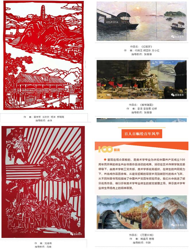 据悉,百人百幅绘百年风华——庆祝中国共产党成立100周年书画作品展近日将推出线上展,后期将在滨湖、锦绣校区分别举办线下展览。(艺术传媒学院:武蕾)