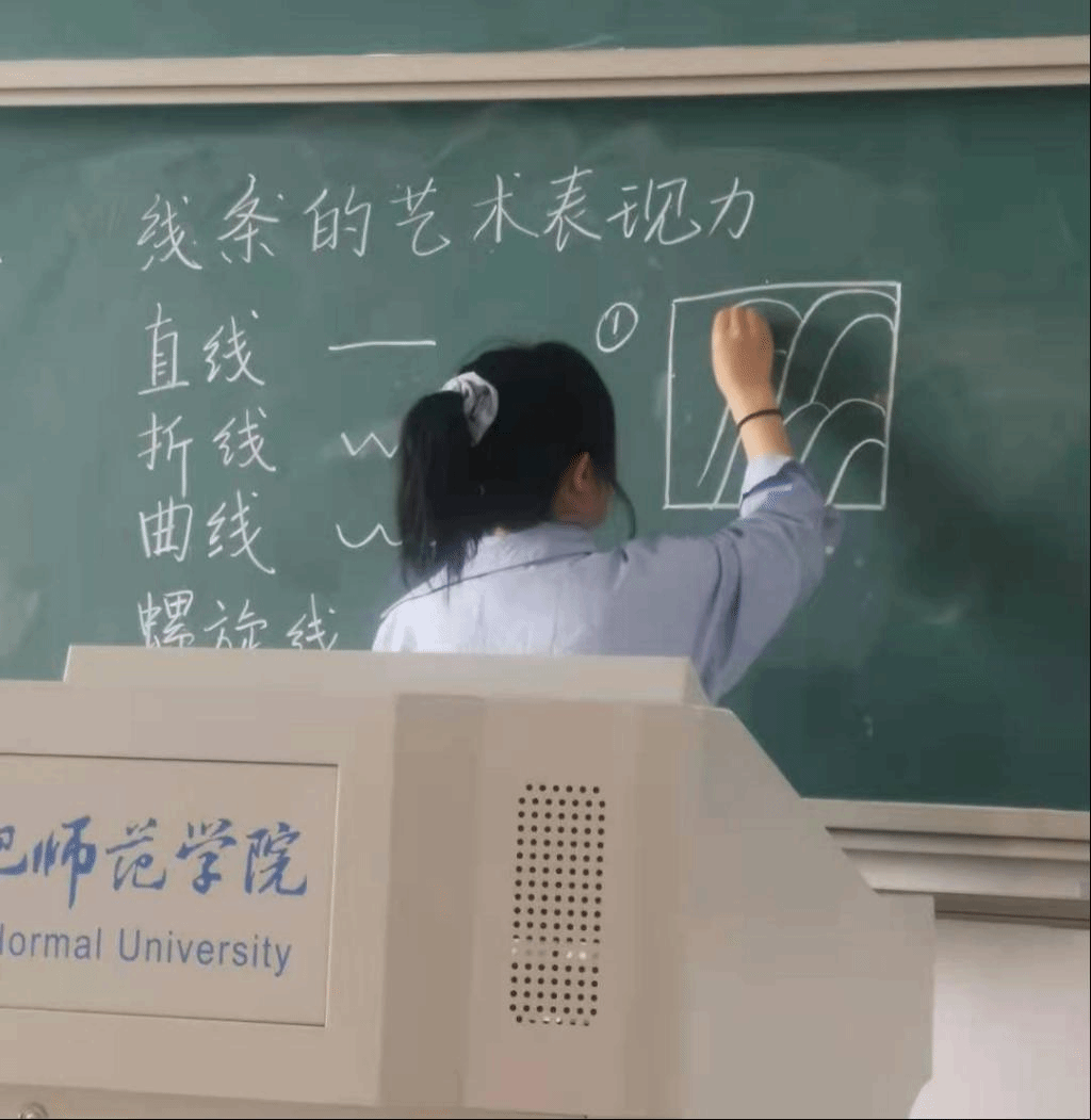 本次比赛的内容为无生上课,重点考查员工的教学设计、教学实施、板书等方面的设计能力和现场教学表现。竞赛中,各位选手结合自身特长,采用猜谜语、讲故事、图片展示、短视频导入、黑板手绘,现场示范等多种形式,体现了美术学科的教学特点。选手们教态自然、大方得体,教学设计科学严谨,教学思路清晰,语言表达准确精炼,板书设计简明精要,能体现出美术学专业“会画会教善研”的新型美术教师的育人理念。