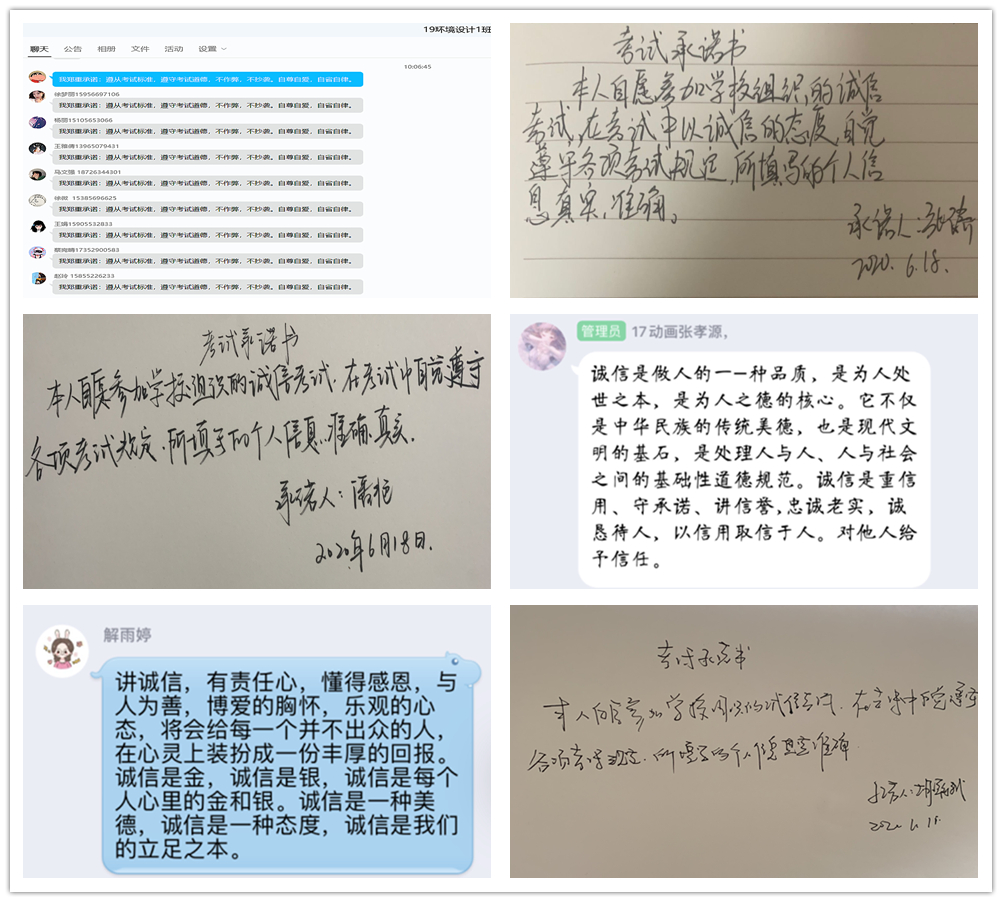 为引导新时代青年老员工讲诚信、践诚信,辅导员通过线上主题班会发出倡议,号召全体同学在疫情防控期间,积极配合学校、社区做好疫情防控工作,同时做到诚信用网,不造谣、不信谣、不传谣。同时,结合近期考试安排,围绕“诚信考试”这一主题,各班组织开展了“诚信云宣誓”活动,同学们通过班级QQ群进行诚信考试宣誓,坚决做到端正考风,诚信考试、诚信做人,争做新时代文明青年。