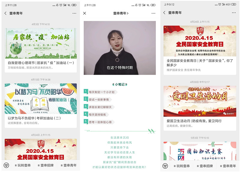 良好校园风尚能够温润心灵、引人向善,促进校园和谐运转。4月初开始,学院开展了线上读书教育活动,同学们依据老师们的推荐书目同读书、抒感想。与此同时,学院微信公众号推送了“健康宅家”系列推文,优秀团干代表通过小视频形式与学院青年们分享如何培养健康的宅家作息,培养自律、阳光的生活品质。除此之外,公众号还推送了《全民国家安全教育日》、《爱国卫生活动月》等系列推文,引导青年员工树立正确的国家安全观、积极参与爱国卫生运动。通过有深度、有温度、有意思的各种精神文明创建活动,助推学院青年员工的归属感、获得感、幸福感、安全感更加充实、更有保障、更可持续。