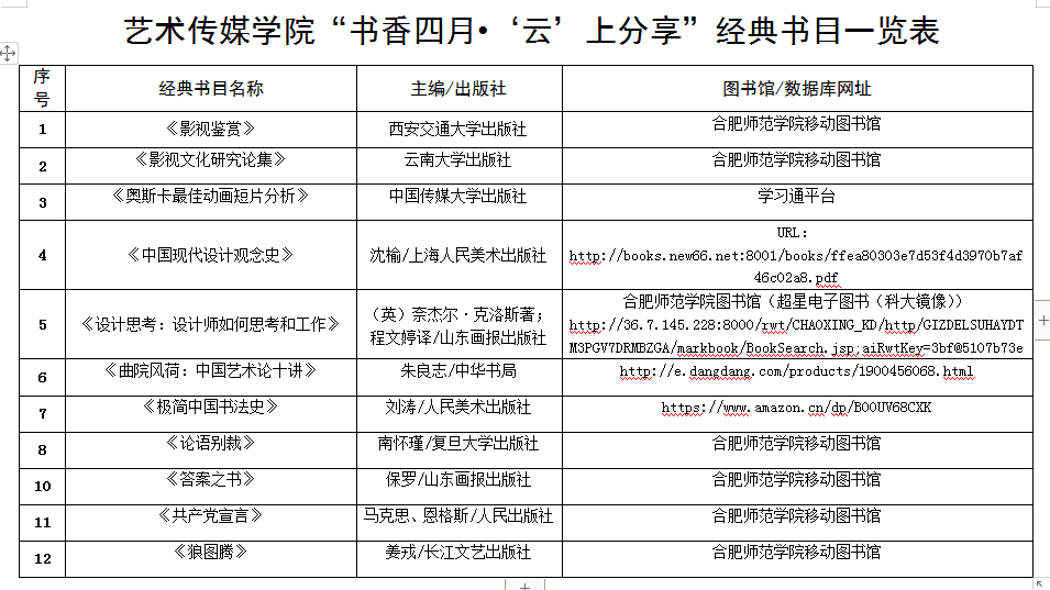 本网讯 读书可以让人保持思想活力,让人得到智慧启发,让人滋养浩然之气。在第25个“世界读书日”来临之际,为了深入推进网络思政,用好疫情防控“活教材”,引导员工求真学问、练真本领,艺术传媒学院于4月23日全面启动“书香四月•‘云’上分享”线上读书教育活动。