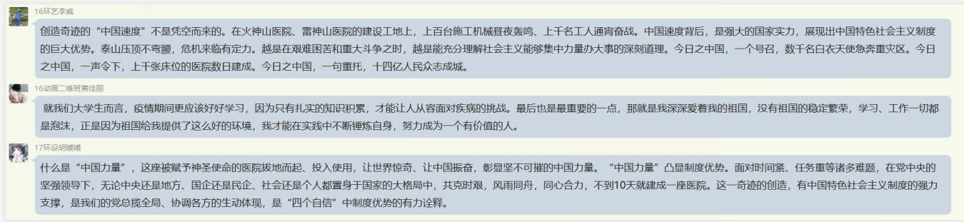 在谈及抗“疫”期间让同学们感动的中国力量时,大家列举了大量“最美逆行者”故事,有“北协和南湘雅东齐鲁西华西”会师武汉,有空军运输机四面八方向武汉空运支援,有公安干警、社区、物业和志愿者下沉一线社区防疫,有建筑工人夜以继日的赶工,有快递小哥不畏病毒“一个口罩一辆车”的后勤服务等等,还有我们英雄的武汉英雄的武汉人民!在这场战斗中,每一个中国人都被感动着、激励着,中国力量无坚不摧,在病毒面前我们14亿同胞在党的领导下手挽手心连心,集中力量胜疫情!
