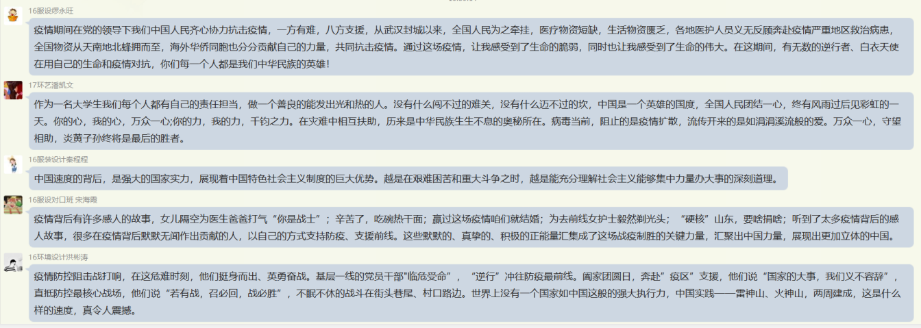 此次线上交流会结束时,同学们还意犹未尽,大家纷纷表达着自己对亲历这场全民战“疫”的真切感受,展现出热爱祖国、支持祖国,为国出力的强烈愿望,用自己火热青春热情为抗击疫情加油打气。(艺术传媒学院:史娌娇)