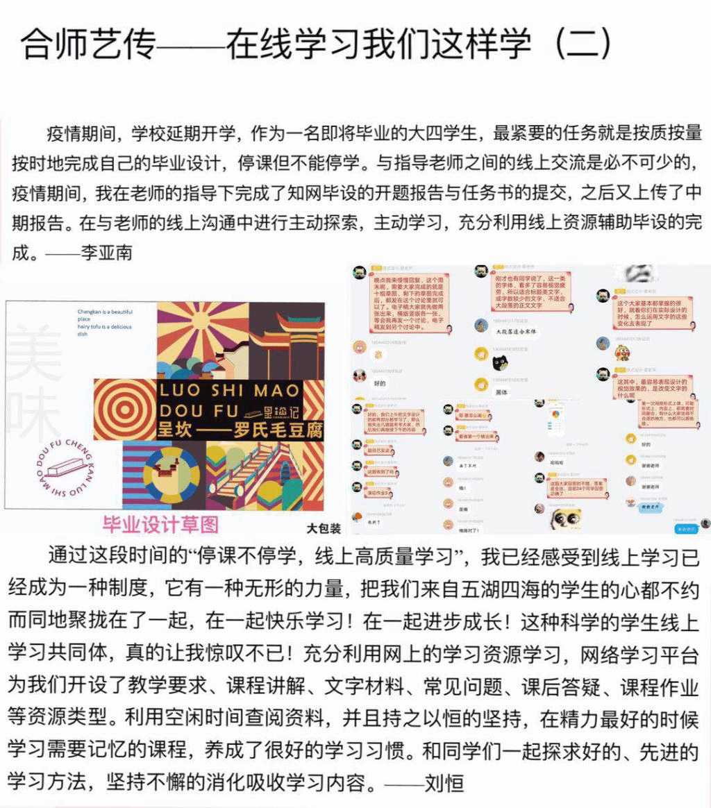 诸如,第三个一为共享一种收获:重视共同学习实现共同进步,发挥在线学习制度转化为学习力量,重点突出了“分享、传递、转化”的线上学习方式,即为突出分享学习实践,传递学习经验,转化学习行为,并结合学院办好“合师艺传—在线教学我们这样教”和“合师艺传—在线学习我们这样学”电子专栏,协同专业课老师和学院实践教研室,协同教师党支部党员,编辑“合师艺传—在线学习我们这样学”电子专栏文稿,通过线上班会、班级QQ群、学院官网、学院微信公众号等途径,进行广泛宣传,加强交流学习经验实践,形成优势互补,达到资源共享,相互学习、相互交流、相互促进、共同提高的目的。(艺术传媒学院:史娌娇、张引)