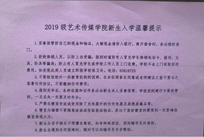 9月6日报到当天,学院开展了安全教育第一课,面向全体新生发放入学温馨提示单,重点温馨提示防范财产安全、防范各类诈骗以及生活安全等,确保每位新生在入学报到时的人身和财产安全,提高新生自我防范意识。