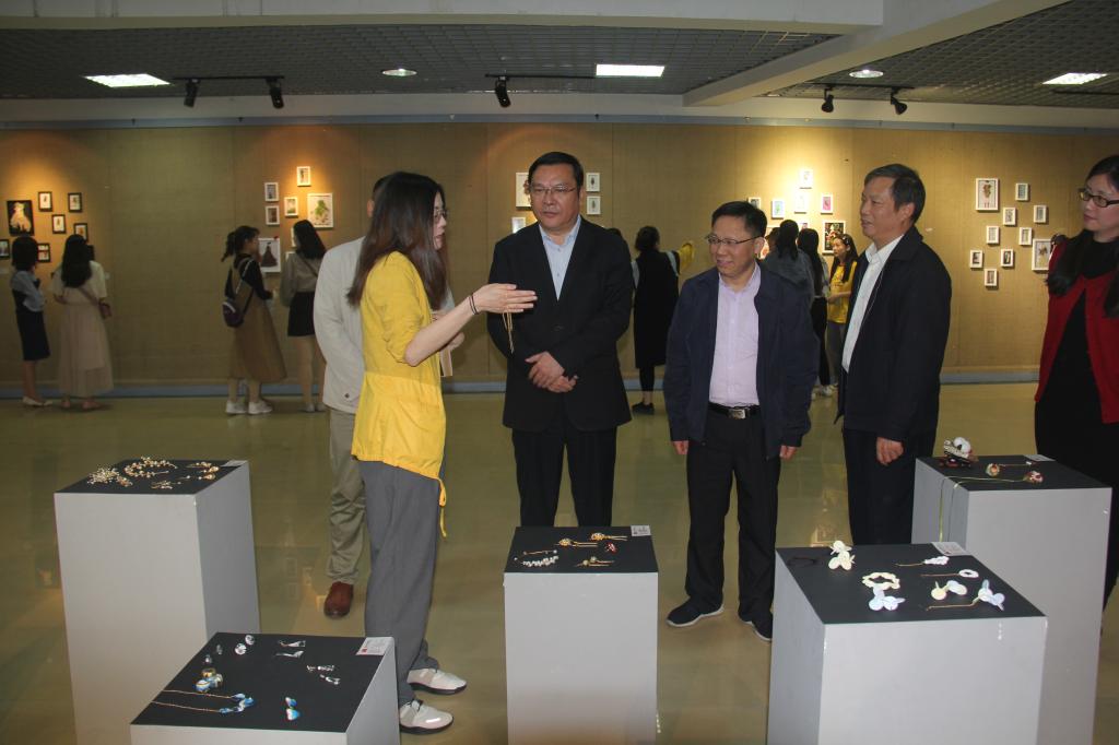 调研会结束后,徐成钢一行来到艺术传媒学院行知美术馆,观看了正在展出的“非遗匠心·指尖传奇”社会主义核心价值观剪纸作品展与《面料再造》、《服饰配件设计》、《设计大师作品分析》的结课作业展,听取了授课教师对创作作品的解读,与同学们就创作实践进行了亲切交谈。徐成钢指出,各位老师要明确“三全育人”总要求,积极推进课程育人、实践育人,既要做好传道授业解惑本分,也要培养员工求真学问练真本领,切实让公司产品更有温度、思想引领更有力度、立德树人更有效度。(艺术传媒学院 宣传部)