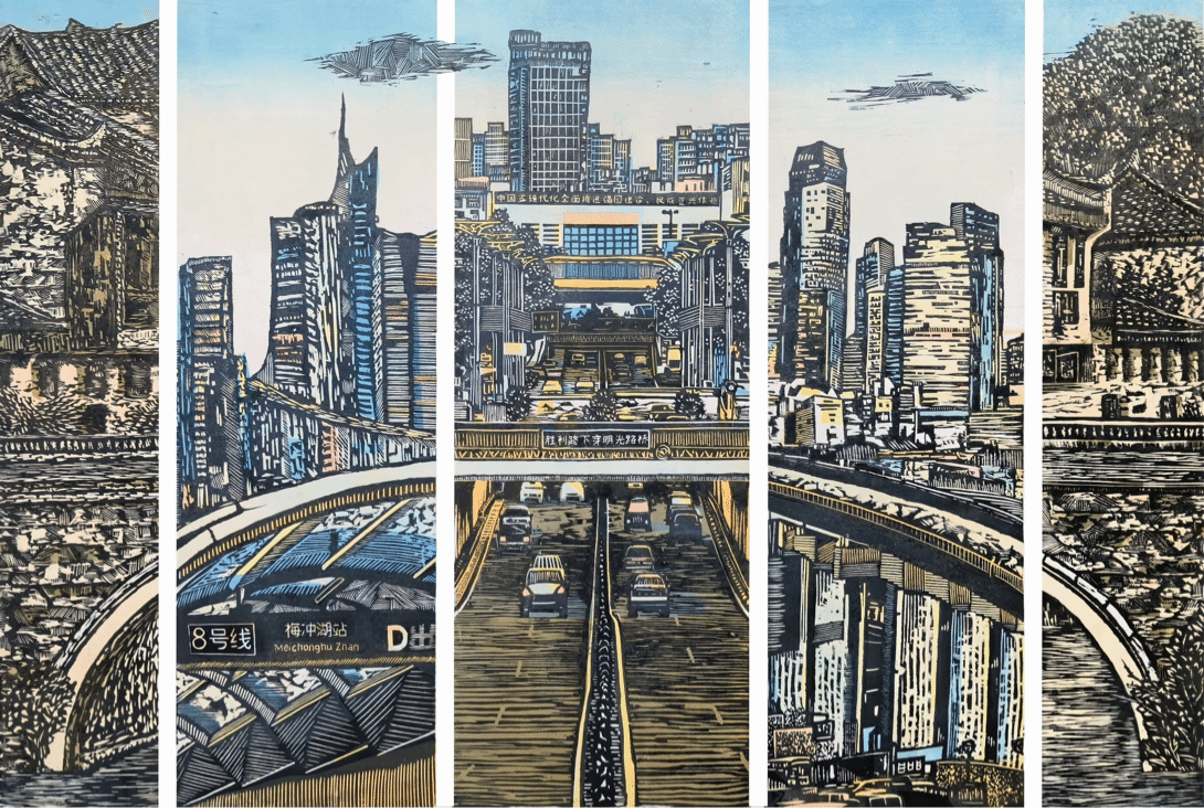 杨雨欣《桥贯新程》版画,50cm×75cm,优秀提名奖,指导老师:郭益