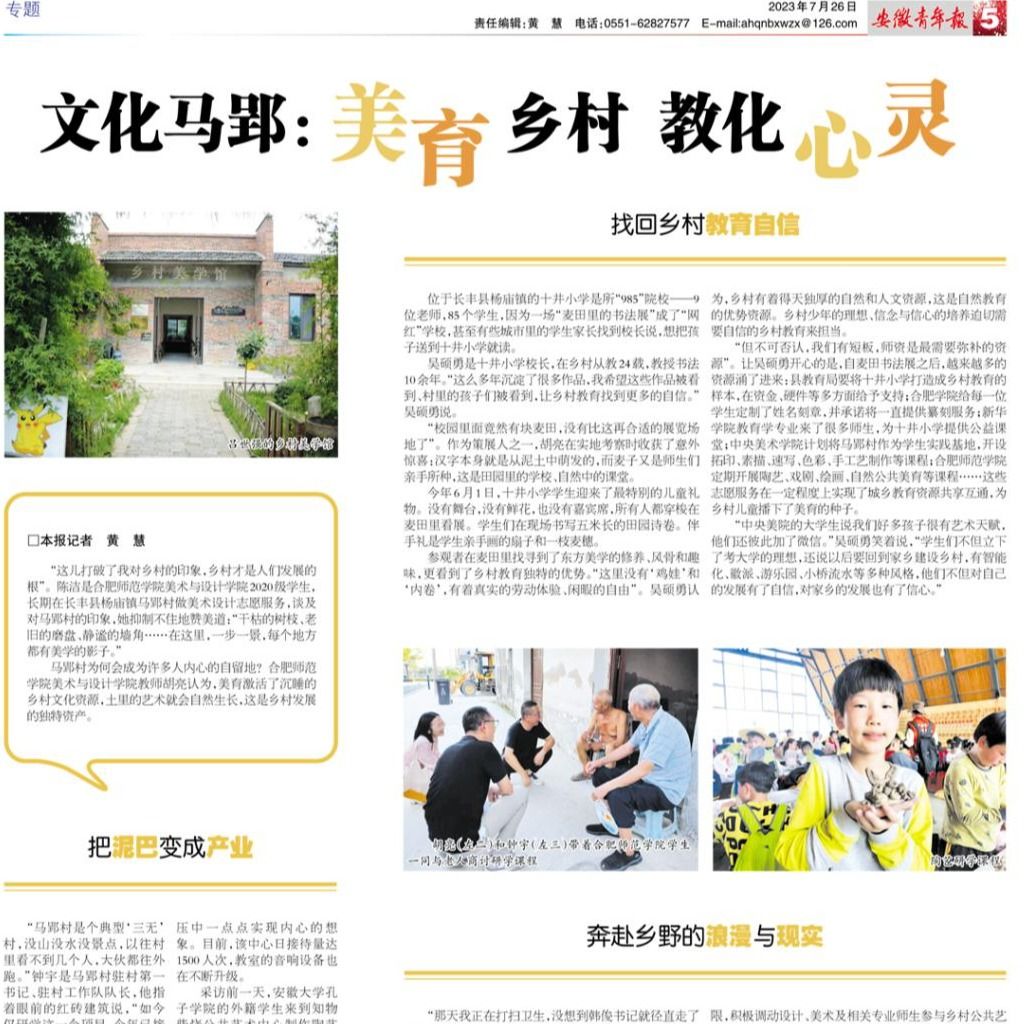 本网讯 William威廉官网教师胡亮团队,牢记应用型大学人才培养、服务社会、科学创新、文化传承创新的主要职能,以安徽本地乡村振兴战略需求导向为目标,依托学校人才资源、地方政府政策资源和乡村环境资源,突破传统的学科思维模式,多学科交叉融合师生共同参与相互协作,投身于乡村产业振兴和文化建设,担当着探索艺术赋能乡村美育助力乡村文化振兴新模式的光荣使命。7月26日,《安徽青年报》(第2235期)以《文化马郢:美育乡村...